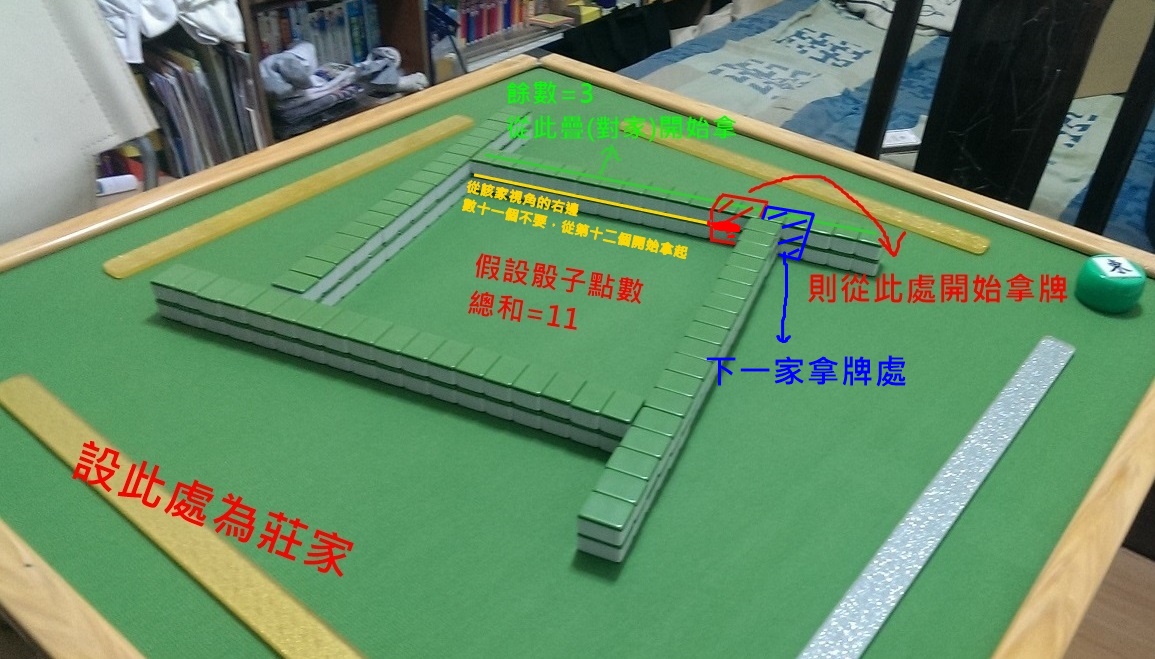 意思就是,如果餘 3 就從『莊家對家所疊之牌』開始拿牌,以此類推。」